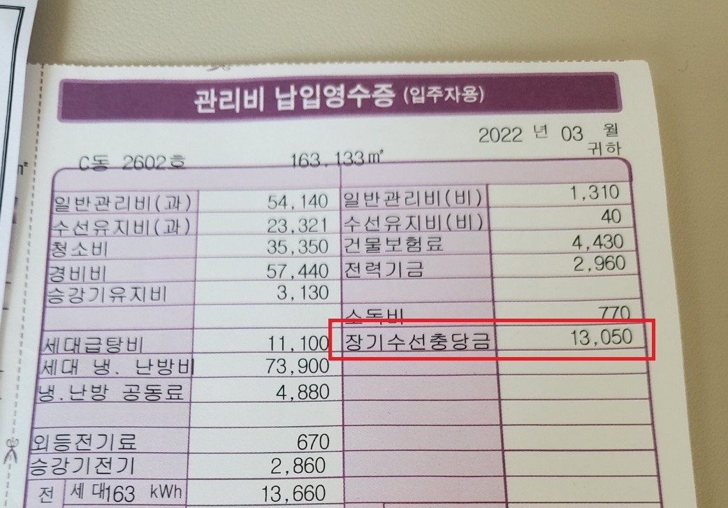 이런 시설의 보수는 상당한 금액이 들어가기 때문에 한꺼번에 부과하지 않고 필요할 때 꺼내 쓸 수 있도록 모아두는 돈입니다.