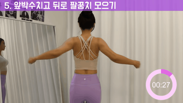 5. 앞에선 박수를 치고 뒤로는 팔꿈치를 모으며 견갑골을 모아줍니다.