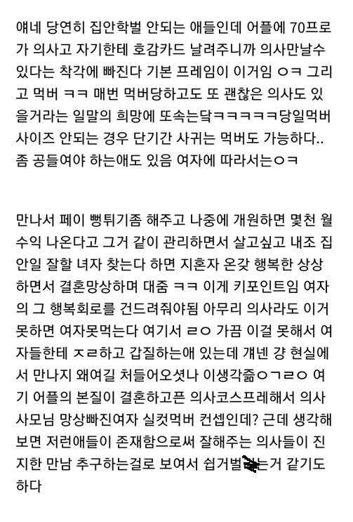 한 남초 싸이트의 의사가 소개팅 어플에서 먹버하는 방법 글의 캡쳐본 입니다.