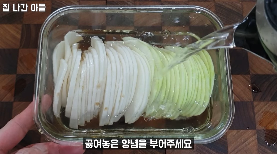 1. 무즙을 뺴고 남은 무에 끓인 양념물을 부어주세요.