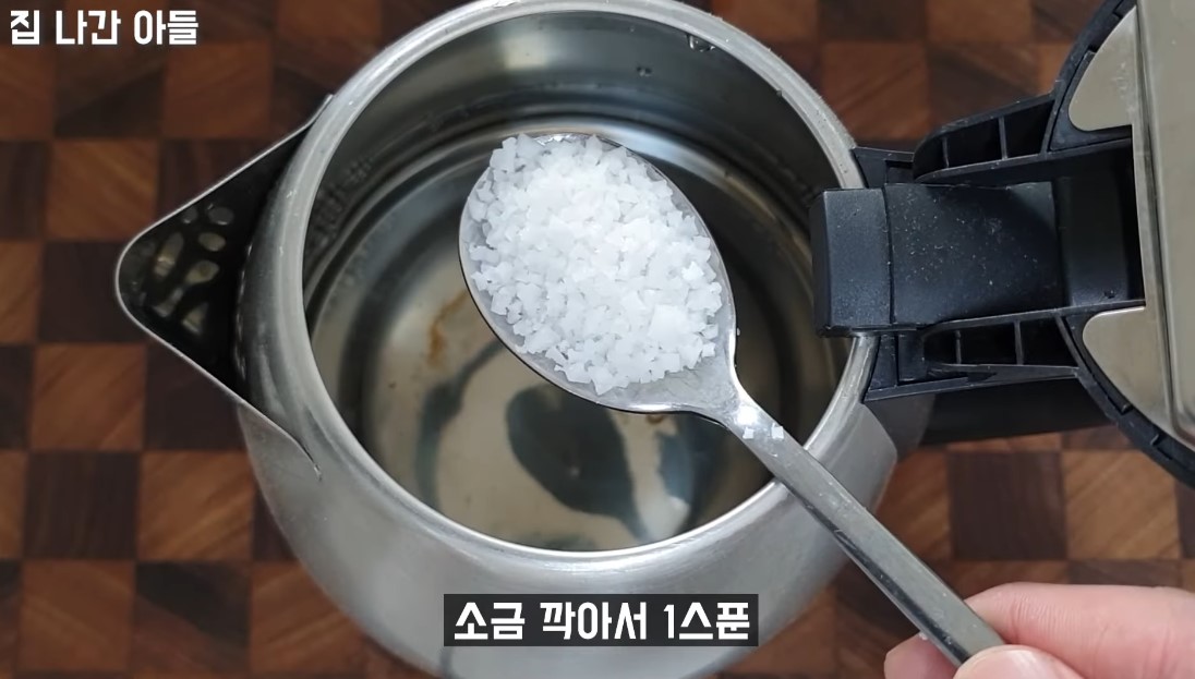 5. 커피포트에 식초 1컵, 소금 깍아서 1스푼을 넣고 끓여줍니다.