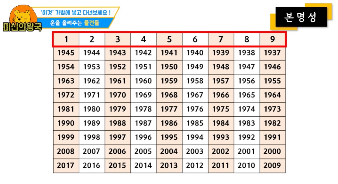 태어난 년도에 따른 자신의 본명성 숫자를 확인해주세요.