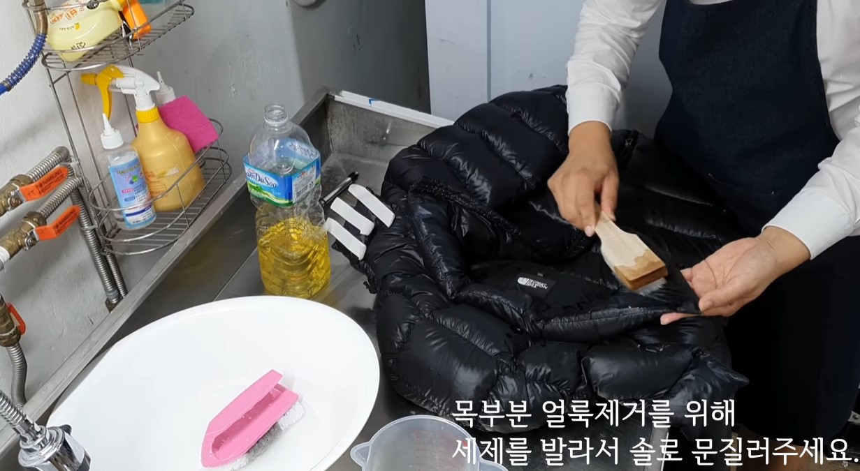 2. 섞은 세제를 목부분과 손목 부분처럼 얼룩이 생긴 곳에 솔을 이용해 발라서 문질러줍니다.
