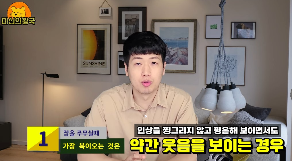 반대로 인상을 찡그리거나 슬퍼 보이게 잠을 자는 것은 운이 떨어집니다.
