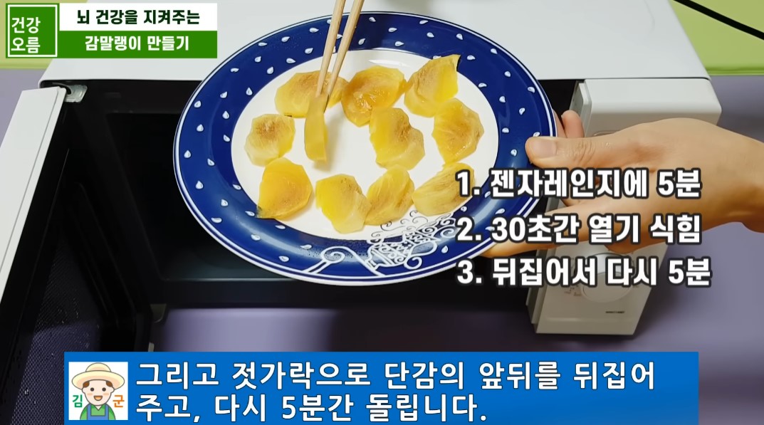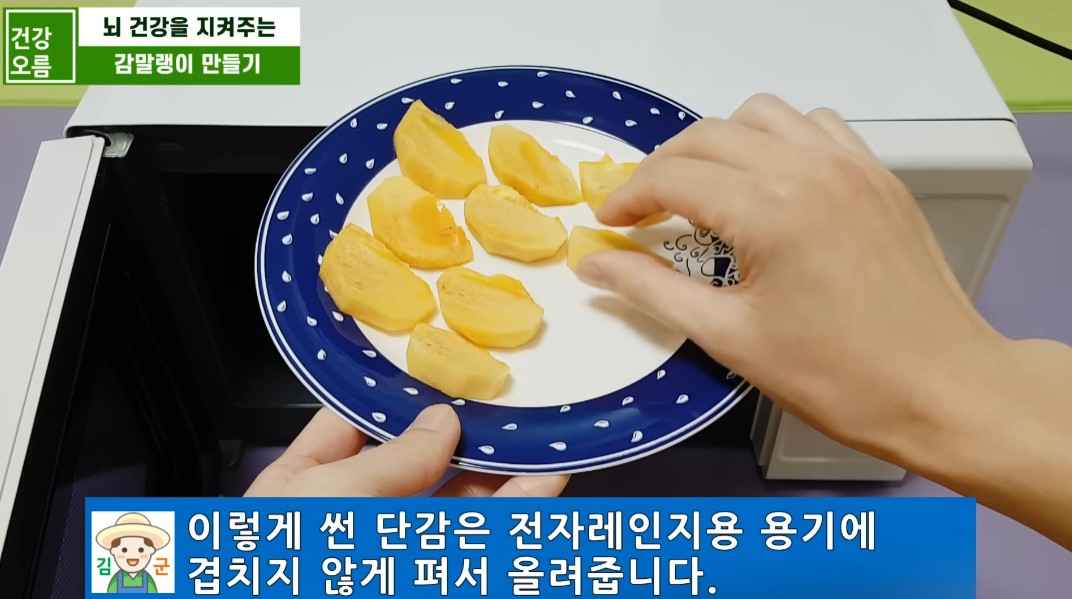 감의 두께나 전자레인지의 출력에 따라 시간에 차이가 날 수 있으니, 만들 때는 타지 않도록 확인하세요.