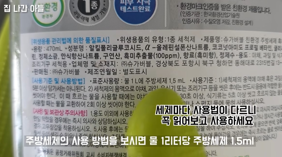 주방세제의 사용방법을 보시면 물 1리터당 주방세제 1.5ml 라는 표시가 있습니다.