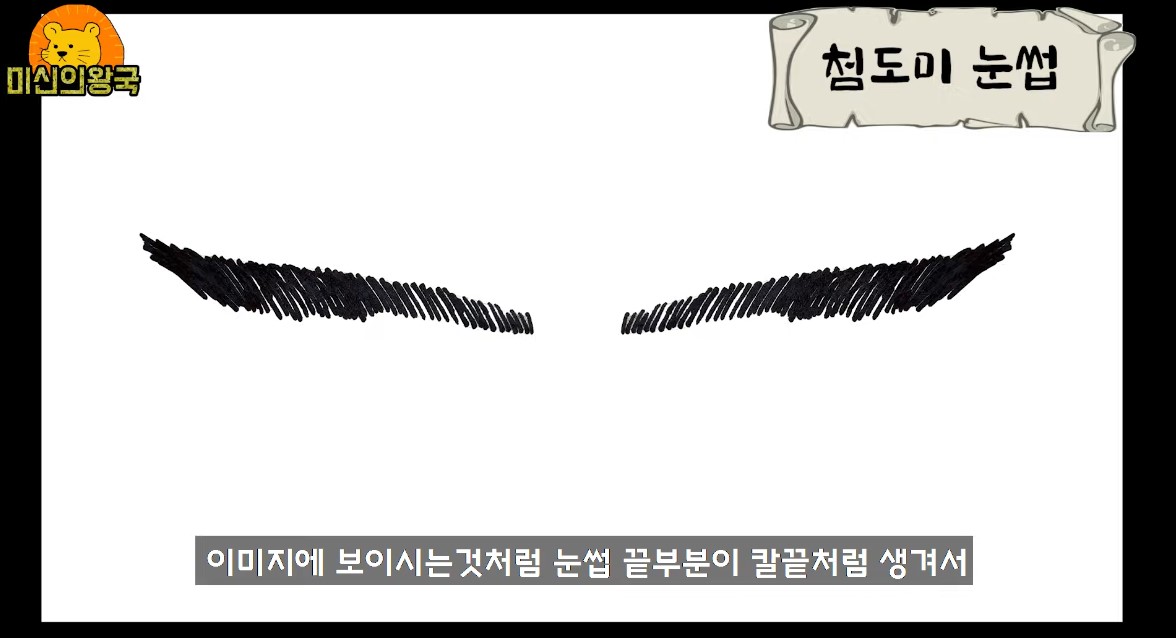 사진처럼 눈썹 끝이 칼끝처럼 생긴 모양이 해당됩니다.