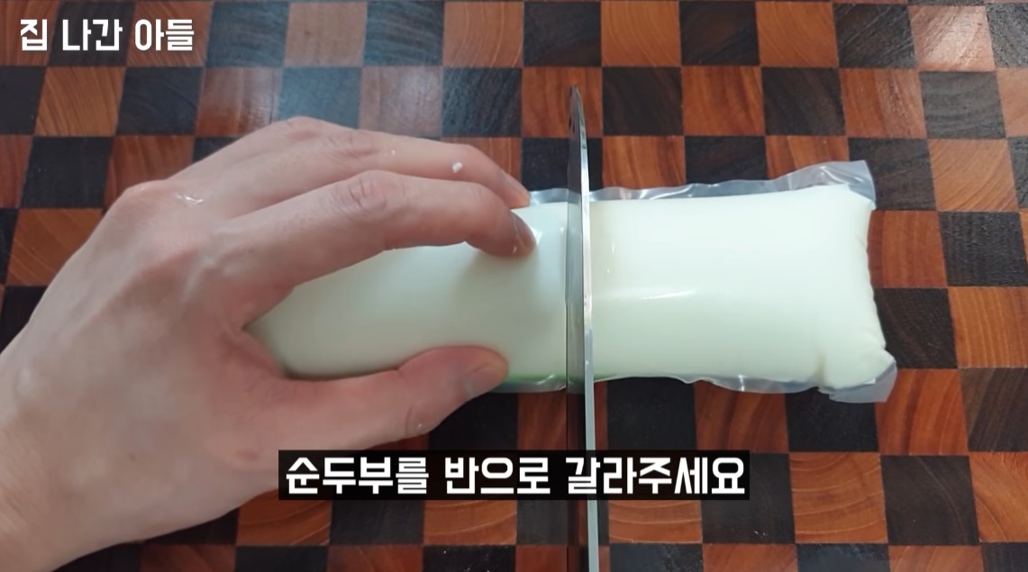 1. 먼저 순두부는 반으로 갈라줍니다.