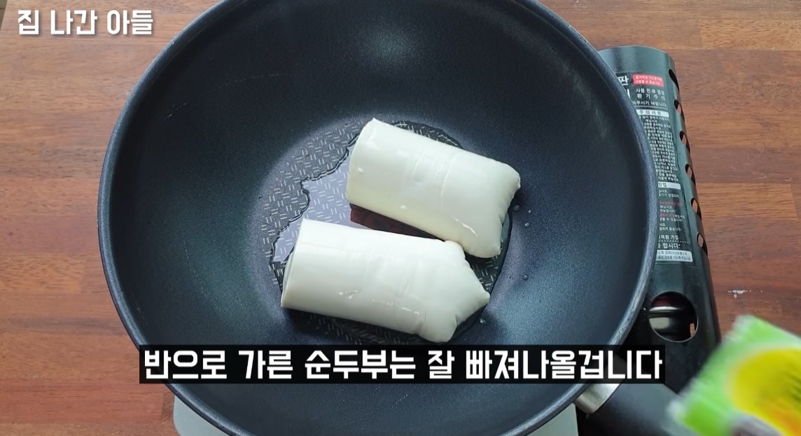 5. 기름을 두른 뒤 반으로 가른 순두부를 올려줍니다.
