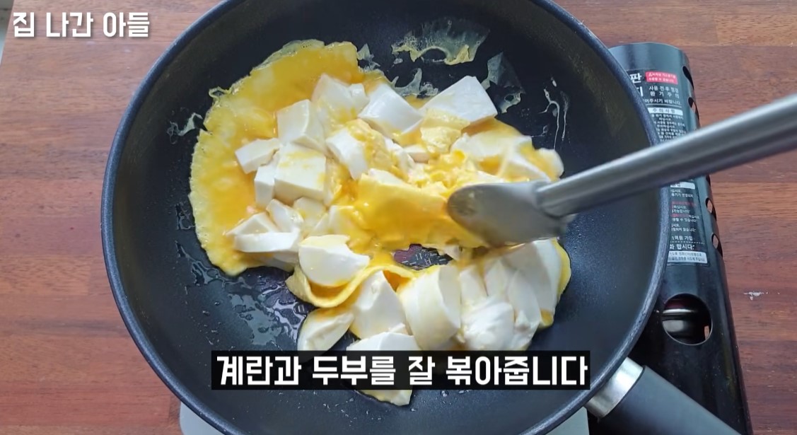 7. 그다음 두부를 먹기 좋은 크기로  대강 썰어준 뒤 계란과 두부를 잘 볶아줍니다.