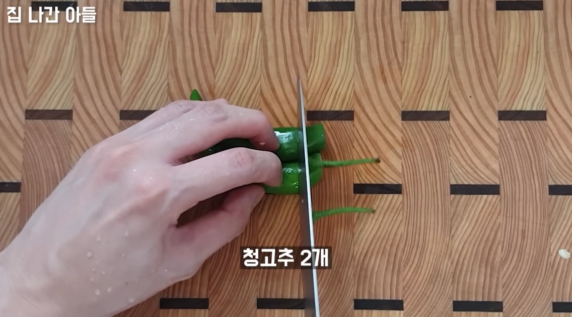 4. 색감과 맛을 더해줄 청고추와 홍고추도 두개를 썰어서 준비해 놓습니다.
