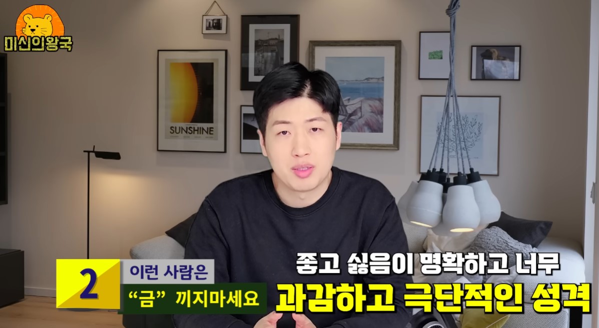 성격이 엄청 급하거나 답답하진 않는데 강단있고 호불호가 명확해서 독불장군이라는 말을 듣는 분들은 금 기운을 멀리하는 것이 좋습니다.