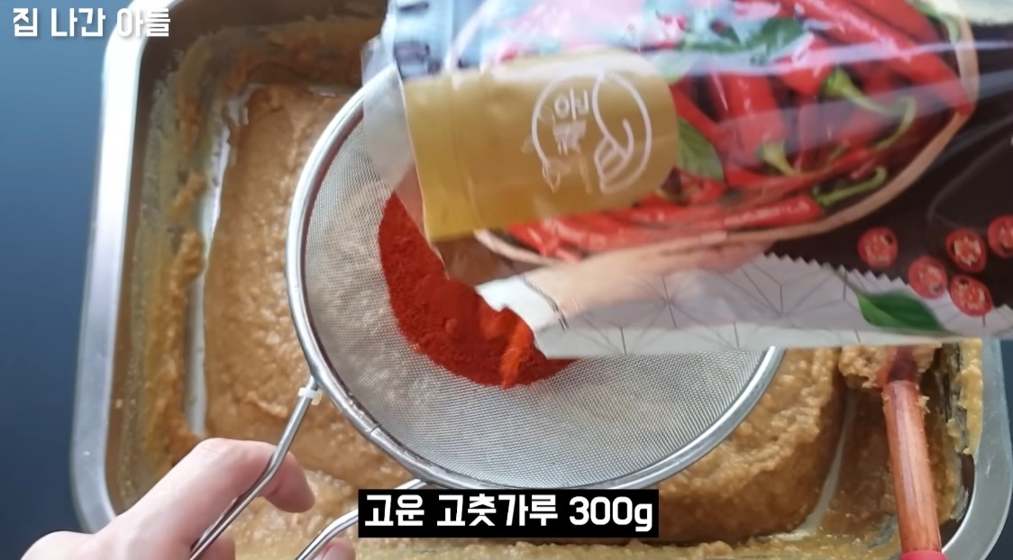 4. 고운고춧가루 300g을 채에 잘 걸러서 넣어줍니다.