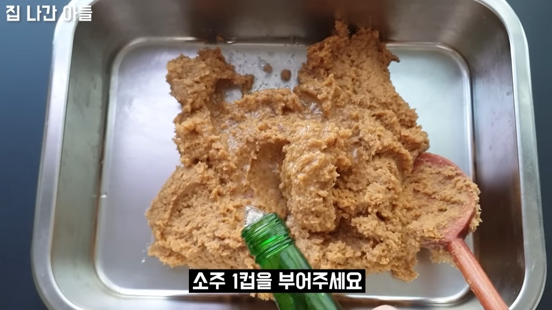1. 큰 바가지나 통에 된장 500g을 넣고 소주 1컵을 된장에 부어줍니다.